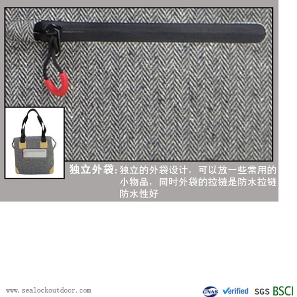 3. PVC material, notranji žep z vodoodporno zadrgo za zapiranje.